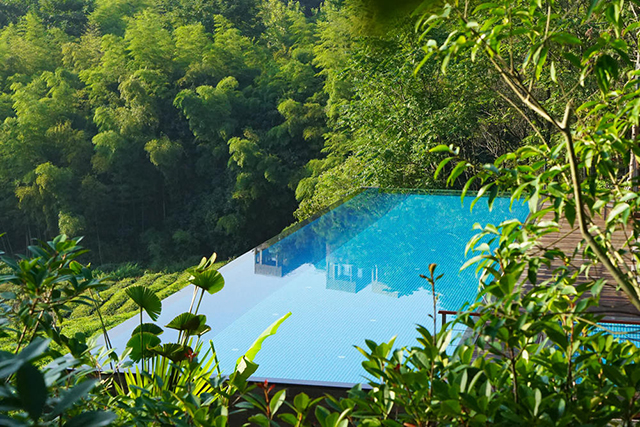 通透晶莹的外观,与外界能够很好的融合在一起。让人身在池中就可以尽情观赏青葱蓊郁的山景,体验畅游在大自然中的感觉。